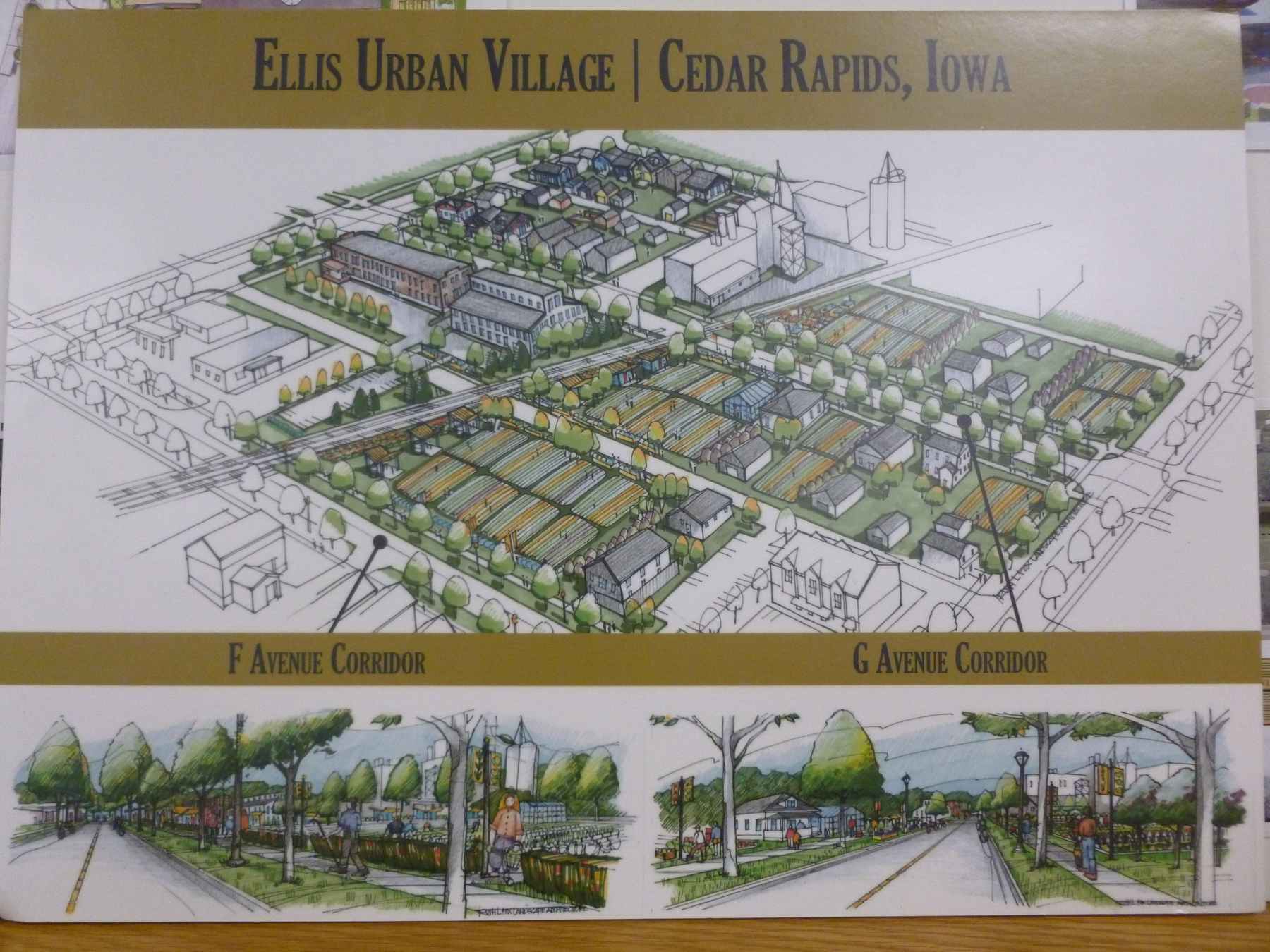 As the flood rehabilitation progressed, Block by Block started to realize how deep and varied the community’s troubles really are. Historically one of the lowest-income parts of Cedar Rapids, the Taylor and Time Check neighborhoods are both in census tracts classified as “food deserts” by the USDA – meaning they have little or no access to fresh produce. Rates of obesity in fifth graders are eleven points higher than the national average. Out of these realizations came the idea for the Ellis Urban Village, an affordable, green community made up of residences and local businesses, anchored around Iowa’s first Urban Farm and a comprehensive Urban Food education center. The initial plans for the Urban Village are shown above.