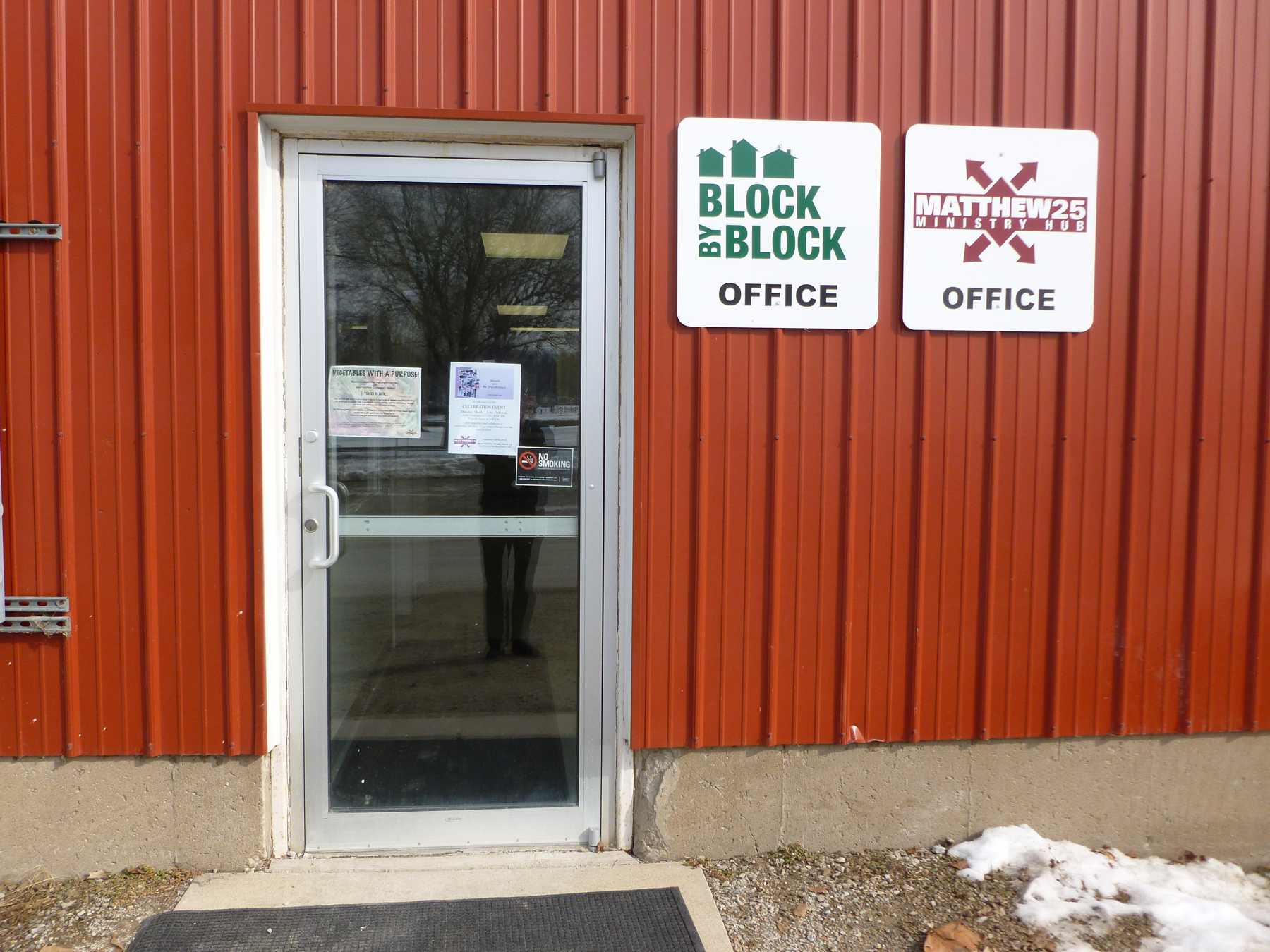 The entrance to the Matthew 25 Ministry Hub headquarters at 225 K Ave. NW in Cedar Rapids. This building is also the home of Block by Block, the multi-organization partnership headed by Matthew 25 that renovated more than 270 homes in the wake of the 2008 flood. Most of that work is done, but M25 still owns several properties in the neighborhood that have been or are in the process of being renovated as sustainable, affordable single-family homes. It’s fitting that Block by Block is headquartered here, because the Time Check neighborhood is in the hundred-year flood plain and was one of the communities hardest hit by the flood (and slowest to recover, since any development on the flood plain now requires an application to FEMA).