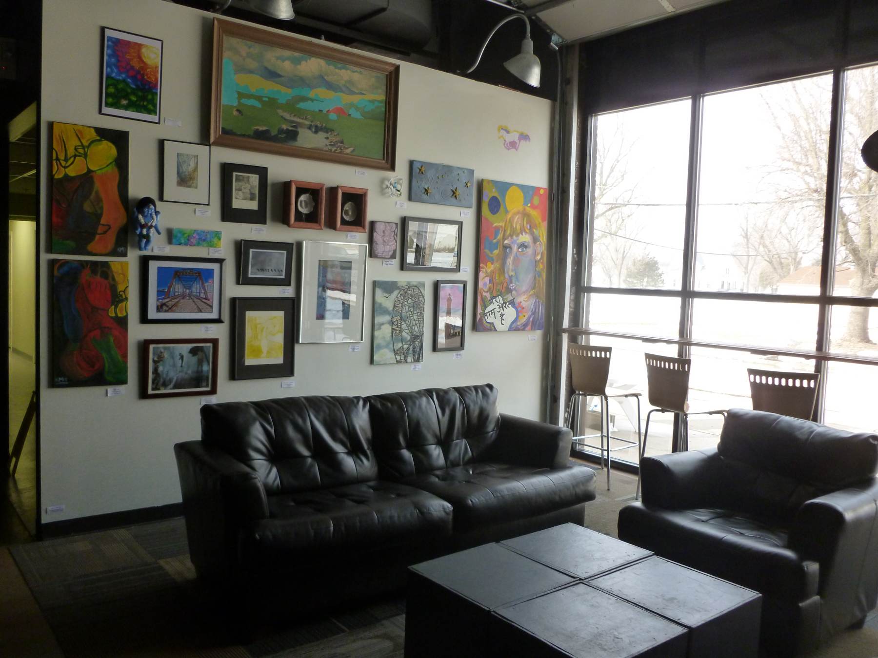 One of the coolest things about the M25 headquarters is that it is not only an office. It’s got all this other awesome stuff attached. The above pictures are from Groundswell, which is a community gathering and youth empowerment space complete with stage, projection set-up, kitchen, couches, and art gallery. Local bands can book the space for concerts for dirt cheap, and the popular open mic nights include music, poetry, and original short films. I don’t know a lot about the Cedar Rapids creative scene, but from what I can gather Groundswell creates an important venue for artistic expression of all kinds that perhaps didn’t exist before, especially for young people.
