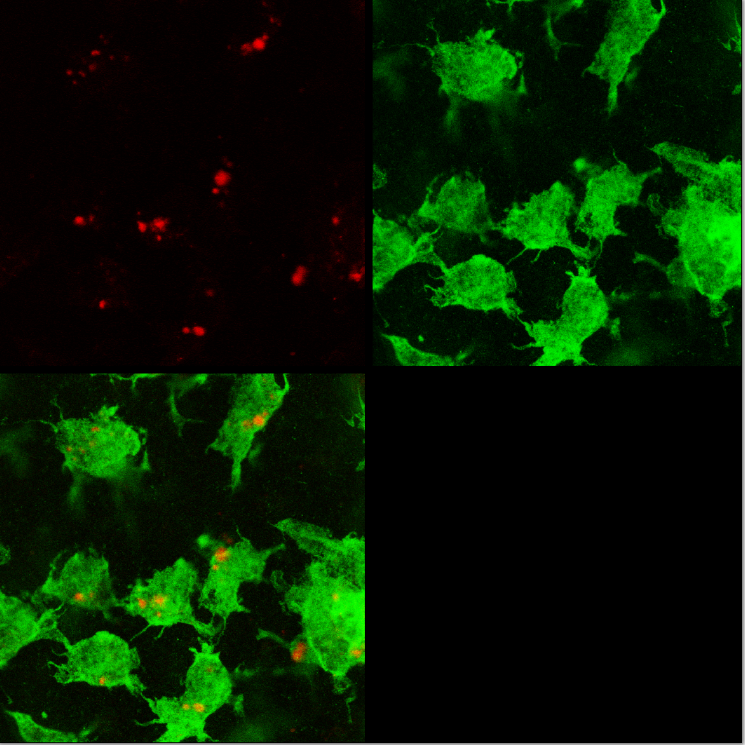 The top left image is of the tagged non-enriched exosomes. The top right image is of our microglia staining. And the bottom left image is an overlay of the top two images, which showed us exactly where in the slice cultures the exosomes went!! So neat!!!!!