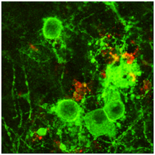 We noticed something really interesting about the staining for the oligodendrocytes. The exosomes, which are shown in the red image, outlined the oligodendrocytes (which are shown in the green image). At first we didn’t notice this because as you can see in the 3rd image, which is an overlay of the red and green images, the red outline isn’t distinct. So we didn’t count many positive cells (positive cells=cells that contained the exosomes) at first. However, once we noticed the red outlines, we determined that those were also positive cells.