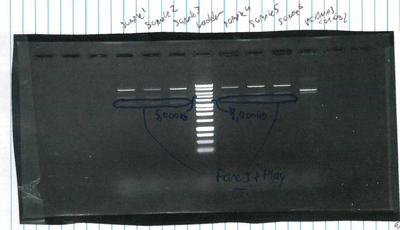 The purified plasmid containing the FLAG-tagged FANCJ was run on an agarose gel to confirm the proper vector and insert were present. The Gel showed that they were.