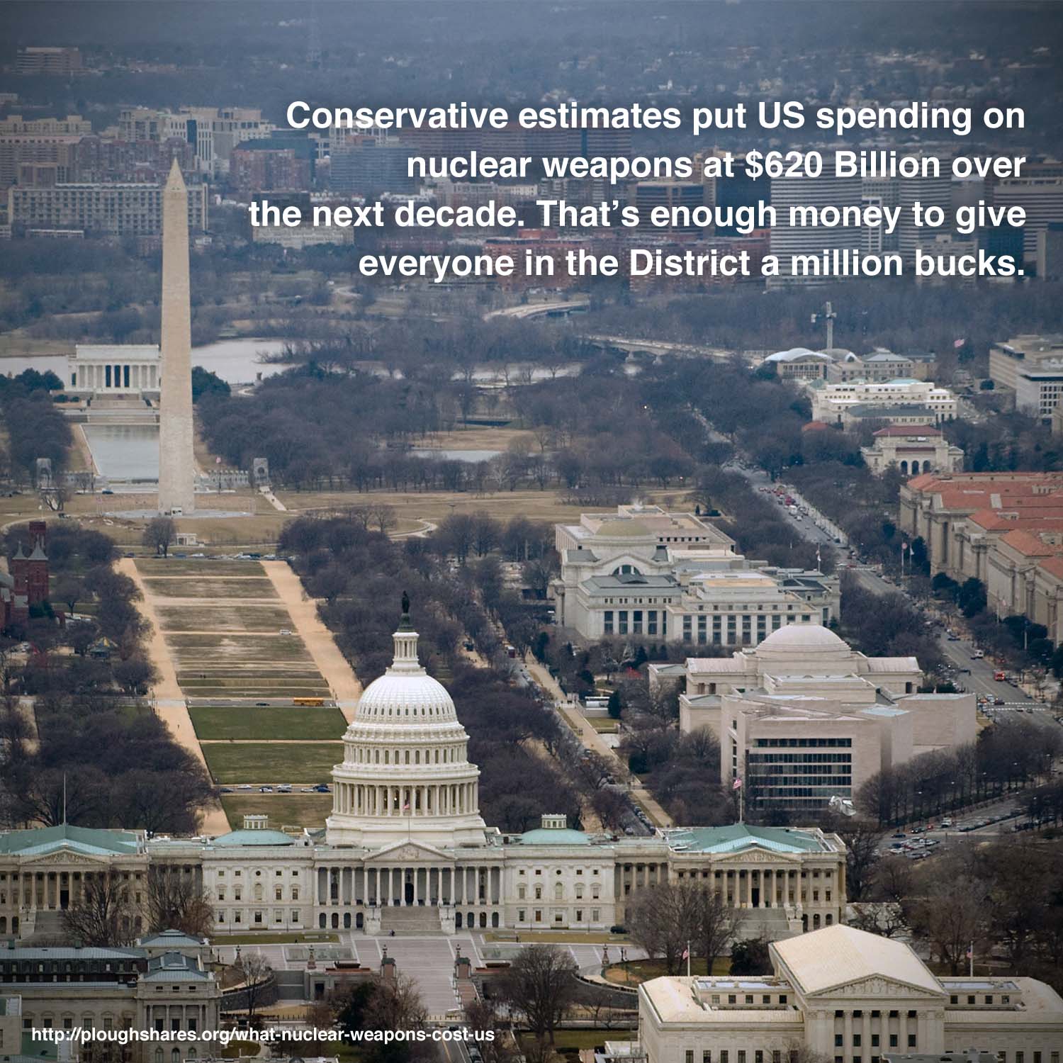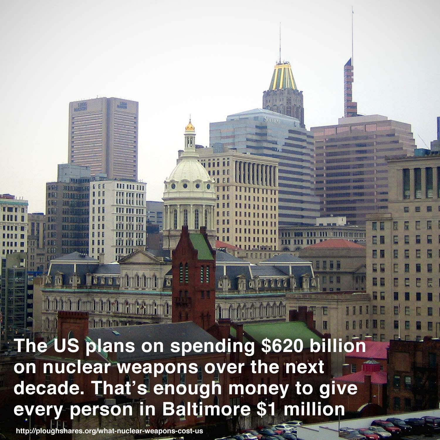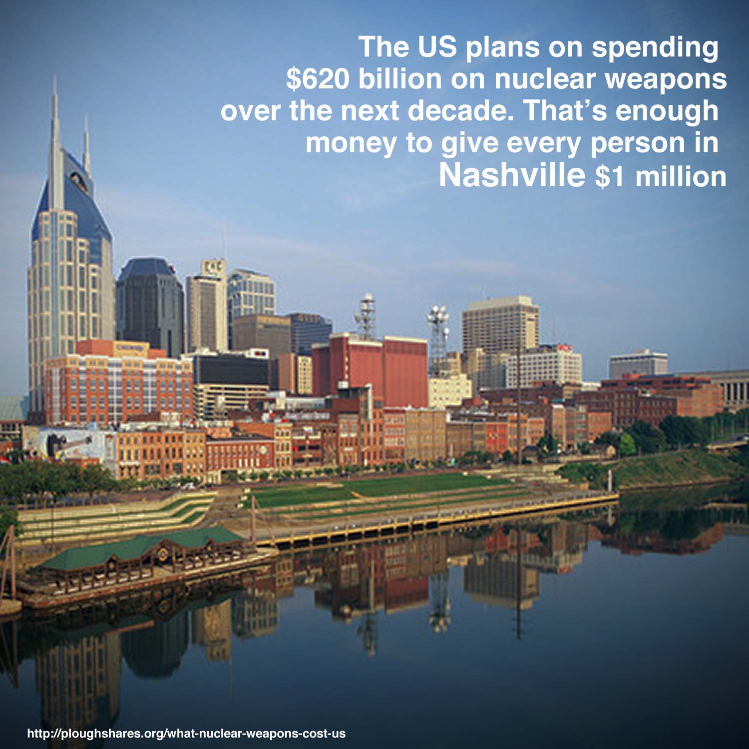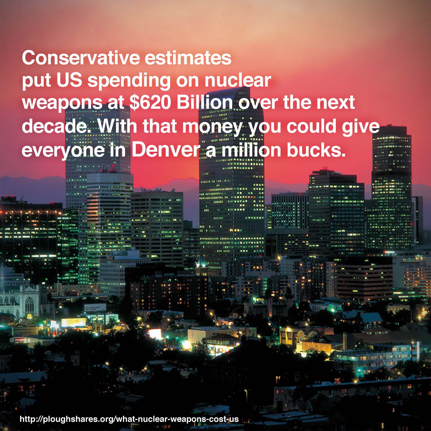 On the creative front I designed a new mini-series of info graphics to roll out on the social media platforms. The purpose of this series was to educate the public about the surprisingly large amount of money we continue to invest in nuclear weapons (620 billion over the next ten years). I was thinking that most people, especially younger people, have trouble contextualizing that number so I tried to come up with a way to emphasize how staggering 620 billion is. I ended up doing a little division and figured that if you reallocated that much money you could give everyone in a city of 620,000 a million bucks each. I found a bunch of cities that size (Baltimore, Boston, dc, Nashville, Denver, Portland, Seattle) and combined pictures of them with the ‘million bucks each’ text. Part of the appeal of this strategy is that the pictures will have a lot of resonance with anybody who lives in those cities or is familiar with them. Here are some of the pictures: