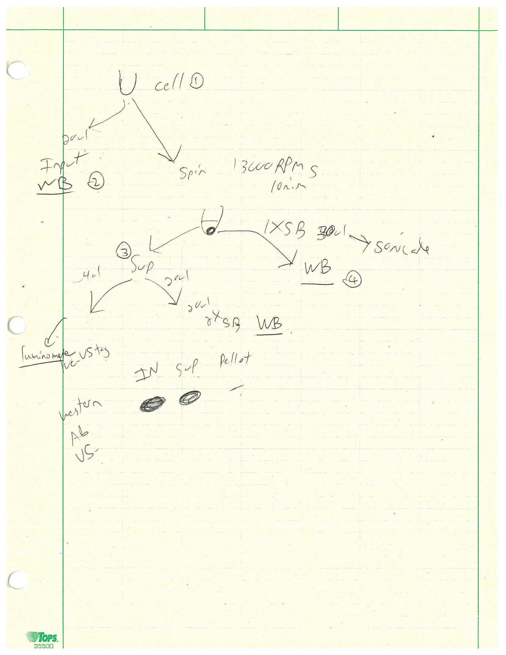 I also did more luciferase assays this week but a much more involved version. I was working on a 24-well plate, half contained PC6-3/TR-156+DOX cells and the other half HeLa cells. For each type of cell we had the wild type neurons, those with R6A mutation, and those with both K2A and R6A mutations. After washing the cells, I put 100 µL of firefly luciferase lysis buffer in each PC6-3 cell well and 70 µL in each HeLa cell well. The 4X sample buffer used in this assay contained 40 mL of Tris, 40 mL of glycerol, 8 g of SDS, and 0.1 g of bromophenol blue. 1 : 4 ratio of 2-mercaptoethanol was also added prior to use of the buffer. After making some 2X and 1X sample buffers from the 4X stock, I used large orifice tips to scrap off the cells and transfer all solutions into one set of microcentrifuge tubes. Then I took 20 µL of each sample to combine with 20 µL of 2X sample buffer into a new set of tubes. This set was the input and would be run on Western blot next week. The rest of the samples were centrifuged at 13,000 rpm for 10 minutes and all supernatants were transferred into a new set of tubes. Then 20 µL of supernatant was combined with 20 µL of 2X sample buffer into a new set of tubes which would be run on Western blot. Then 2 µL of supernatant was combined with 50 µL of luciferase substrate (with buffer) and its light intensity was measured by luminometer. Finally, 20 µL of 1X sample buffer was added to each pellet and would be run on Western blot. This entire process was outlined in the photo below.