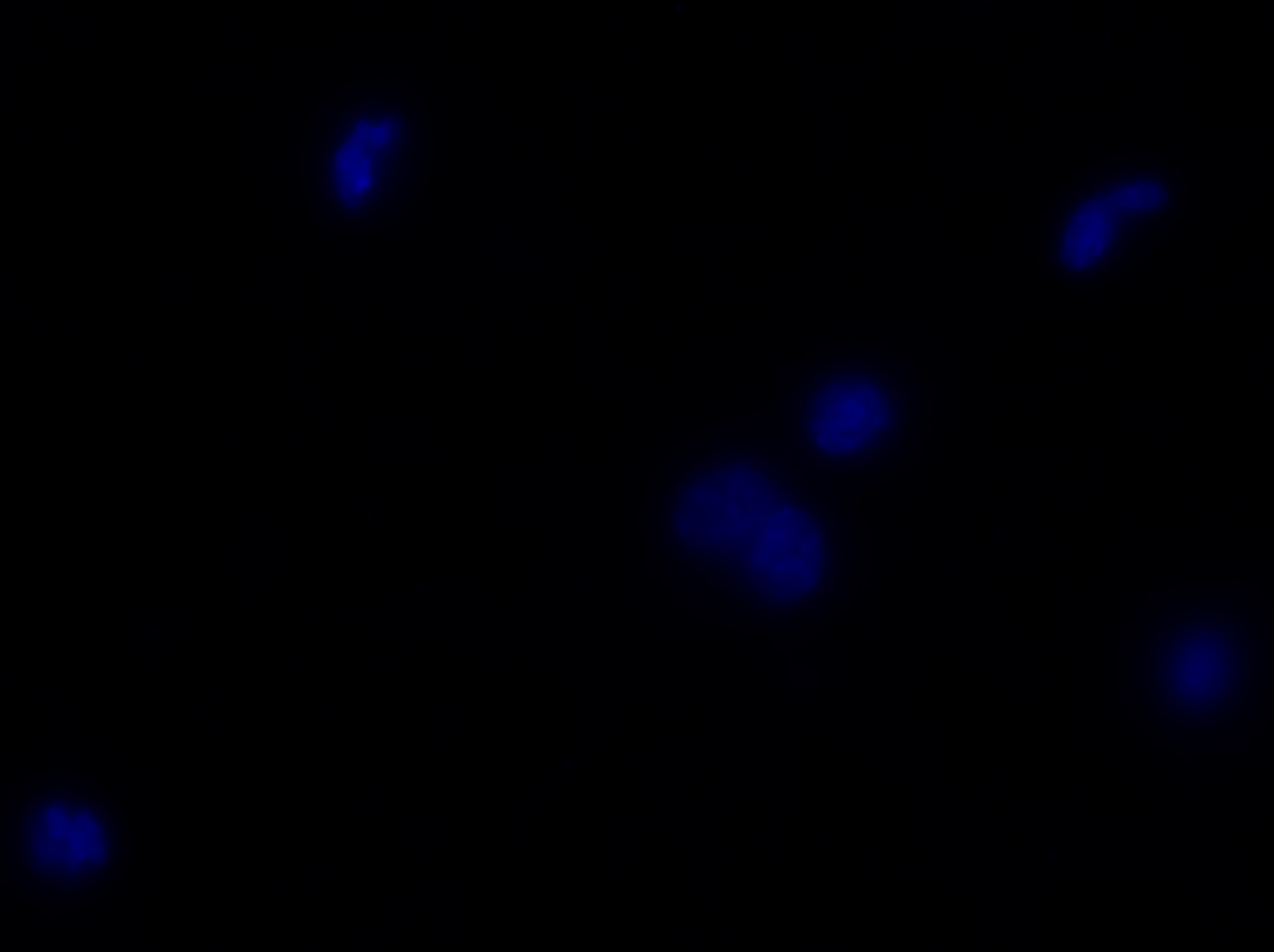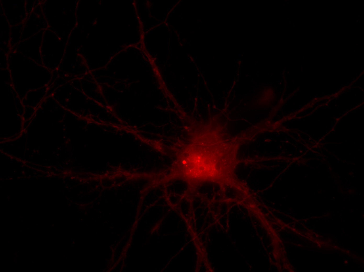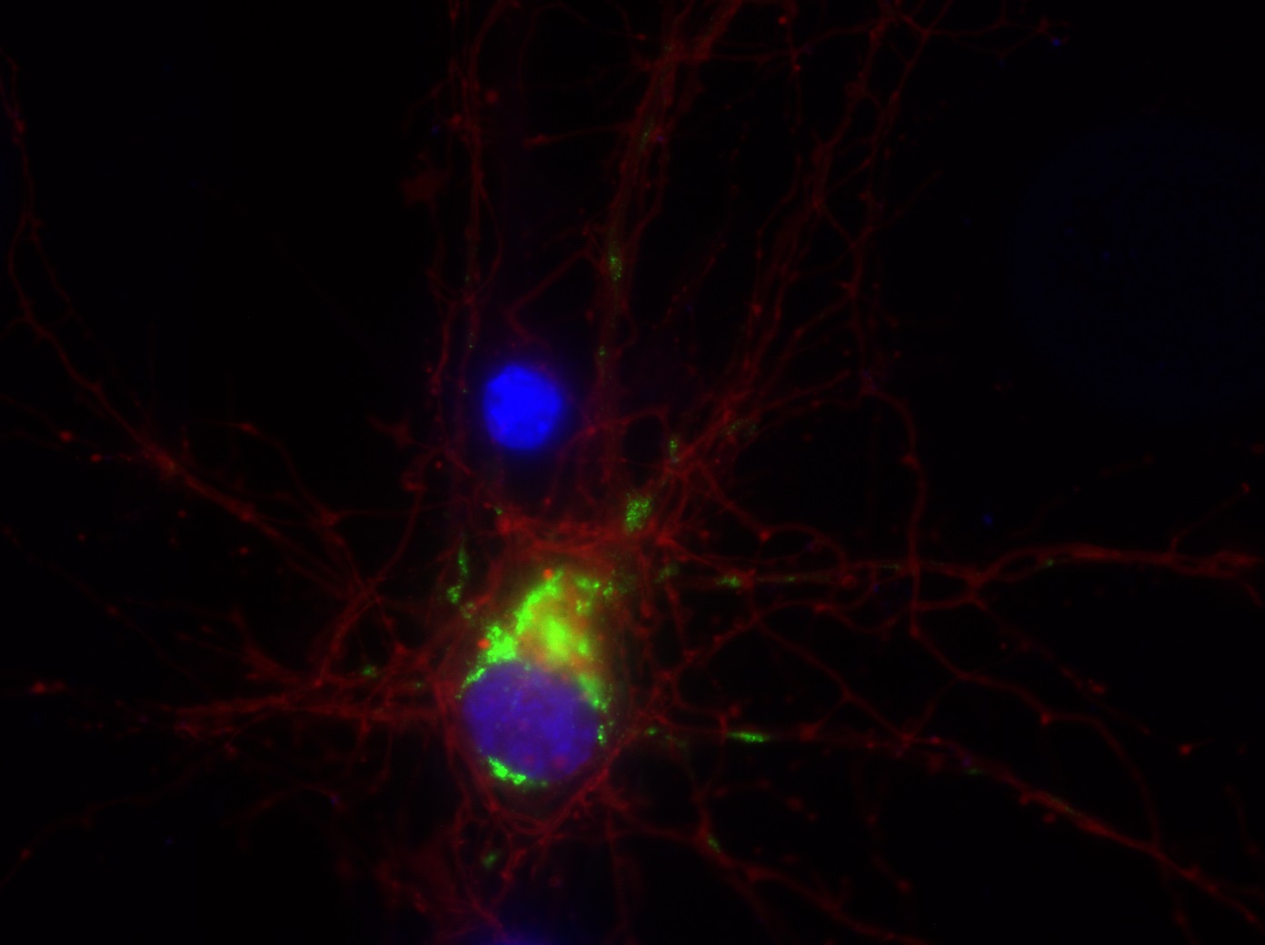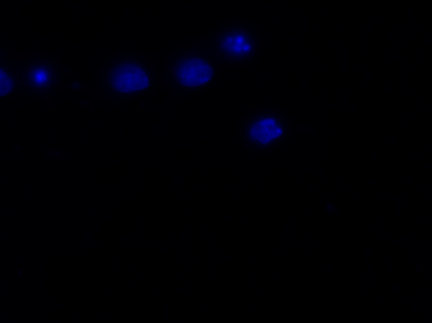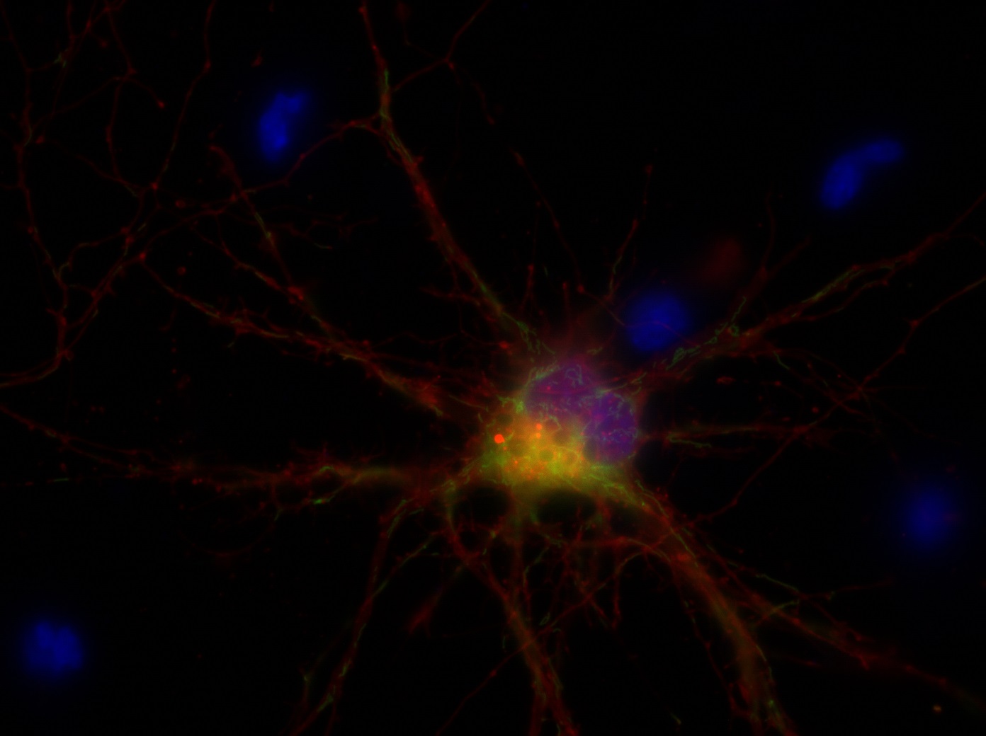 I was blinded toward each well and its corresponding transfection to eliminate potential bias in cell counting. The neurons were cultured from rat embryo hippocampus and we used three channels of the fluorescence microscope to inspect the neurons: the blue, green, and red channels. All the neurons were stained with Hoechst 33342, which only bound to DNA in the nucleus so that we could observe the nucleus in the blue channel. We were only interested in the transfected neurons, however, which all had GFP (green fluorescence protein) attached to Mff (mitochondria fission protein) so that we could see the mitochondria of transfected neurons in the green channel. Last but not least, the plasma membranes of transfected neurons contained Lck-mCherry so that we could see them in the red channel. Therefore, I used green channel to first locate the neurons that were transfected and then switched to blue and red channels to tell if that neuron was living or dead. Generally speaking, a round (elliptical) nucleus that was not uniform corresponded to a living cell and a condensed and uniform nucleus a dead cell. When looking at the red channel, I needed to first identify if the transfected cell was actually a neuron, which was what we were interested in. The wells might also contain glia cells, which could be identified in the red channel by having thicker and flatter processes than neurons. If the cell was indeed a neuron, broken dendrites in the red channel corresponded to dead neurons and intact dendrites living neurons. I posted some pictures of living and dead neurons in three different channels.