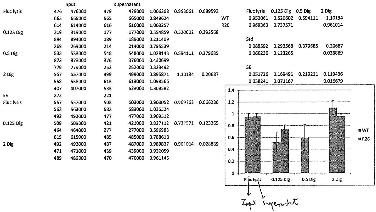 The last assay I did this week was a cell fractionation and Bβ2 luciferase reporter assay using Firefly luciferase, if we had to give it a name. The cells in the 24-well plate were either the wild type neurons or the ones containing R26 mutant. The customed lysis buffer was 50 mL and had 25 mM HEPES (pH = 7.5), 1 mM EDTA, 0.5 mM PMSF, and 100 mM NaCl. I made this buffer from our pre-made stock solutions of 500 mM EDTA (100 µL), 250 mM HEPES and 500 mM NaCl (5.00 mL), 4 M NaCl (625 µL), and 200 mM PMSF (125 µL). The 24-well plate was divided into groups A to D. Group A included wells 1 – 3 and 15 – 18 and was treated simply with 100 µL of Firefly lysis buffer. Group B contained wells 4 – 6 and 19 – 21 and was treated with 100 µL of 0.125 mg/mL of digitonin. Group C, which contained wells 7 – 9, was treated with 100 µL of 0.500 mg/mL digitonin. Group D had wells 10 – 12 and 22 – 24 and was treated with 100 µL of 2.00 mg/mL digitonin. Digitonin was a compound that was supposed to only break up the plasma cell membrane but not the mitochondrial membrane at the right concentration. By treating cells with different digitonin concentrations, we could identify the concentration that broke most of the cell membrane without lysing too much of the mitochondrial membrane apart. The experimental procedure was similar to that of last week. In short, we first lysed the cells open and saved a sample as the input that was measured by luminometer for luciferase activity. Then we spinned the cells down and added 1X sample buffer to the pellet which would be run on Western blot. We took a sample of the supernatant which was measured the same way for luciferase activity. We added 4X sample buffer to the rest of the supernatant which would also be run on Western blot. The flow chart of this assay was shown below. For this Bβ2 investigation, we expected the wild type to have luciferase inside mitochondria and the mutant to block the Bβ2 terminus of luciferase and prevent it from entering the mitochondrial membrane. Therefore, for wild type we expected the luciferase activity to be inside mitochondria (the pellet) and not in cytosol (supernatant). We would expect the exact opposite for the R26 mutants. The results of the luciferase activity assays were shown in the graph below. We could see that the 0.125 mg/mL digitonin concentration was not sufficient to lyse the cell membrane open completely. The 2.00 mg/mL concentration lysed all membranes open, which was the reason the graph showed no difference between the input and supernatant at that concentration. Therefore, another assay with 0.5 mg/mL, which was likely the concentration we were looking for, seemed imperative.