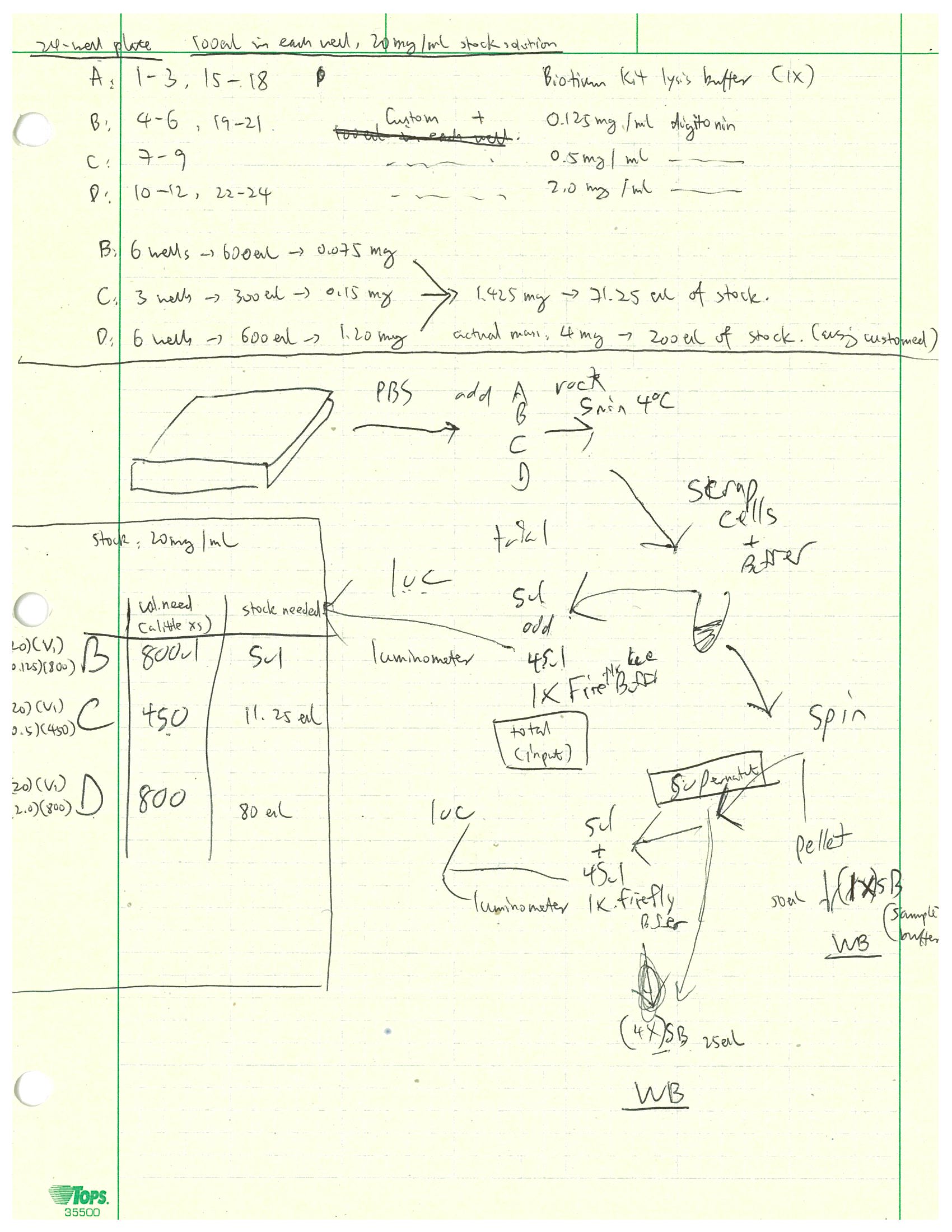 The second assay was conducted with both Gaussia and NanoLuc luciferases on eight 24-well plates and two 96-well plates. Just as I described before, Gaussia luciferase was secreted by cells into the media and could tell us the relative number of cells in each well. This piece of data would be used for normalization purposes. NanoLuc luciferase, however, was contained in the cell body. After being lysed open by the lysis buffer, the amount of NanoLuc could tell us the survival condition of the cells.