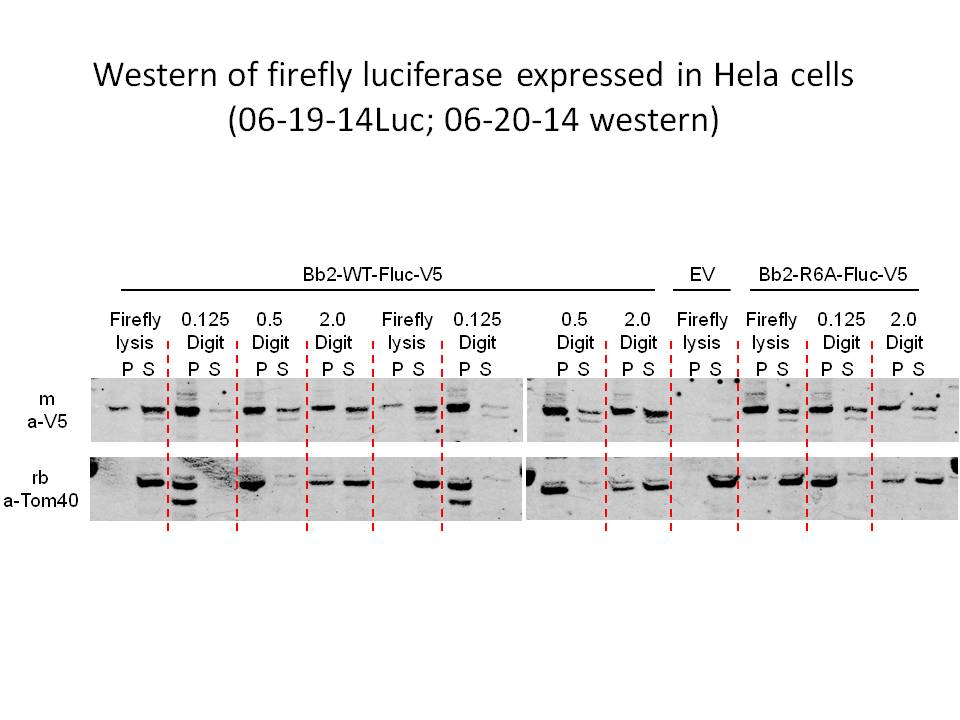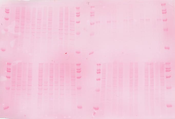 This week was all about Western blot. I ran the samples from the luciferase assays in the past two weeks. Certain samples needed to be sonicated to break up the DNA strands so that they were no longer too viscous to run on the gel. Then I heated the samples at 95 °C for three minutes to denature the proteins so that SDS in the later-added buffer would fully coat the proteins. This was done to make sure that the proteins would run according to their different sizes rather than charges. After a quick spin, I loaded 12.5 µL of each sample into the wells and let the gel run. Then I transferred the proteins on the gel to the nitrocellulose membrane. The transfer buffer used contained 10% of methanol and 1% of 1.0 M CAPS (pH = 11.5) in water. After allowing the transfer process to go overnight, I used Ponceau S, a red dye, to stain the membrane so that all proteins could be visualized by eye. I scanned this stained membrane before washing Ponceau S off the membrane. Then I added the buffer that contained 2% BSA and 0.05% sodium azide in TTBS (Tris-buffered saline + Tween 20) to block all the potential binding spots of the antibodies on the membrane, so the antibodies that I would add in the next step would only bind to the proteins on the membrane. After rocking on the rocker for thirty minutes, I cut the membrane in two halves according to two different probes, which I would expose to two different antibodies. First, I exposed the membranes to the primary antibodies (which targeted the probes) and rocked them on the rocker overnight at 4 °C. Then I washed the leftover primary antibodies off and exposed the membranes to the secondary antibodies (which targeted the primary antibodies). It was important to mention that the probes, which were sequences on the luciferases recognizable by the primary antibodies, were the V5-tag and TOM40. The primary antibodies were the anti-V5 antibody from mouse and anti-TOM40 from rabbit. The secondary antibodies were goat anti-mouse and goat anti-rabbit. Finally, I used Odyssey infrared scanner to scan the membrane and the result was shown below.