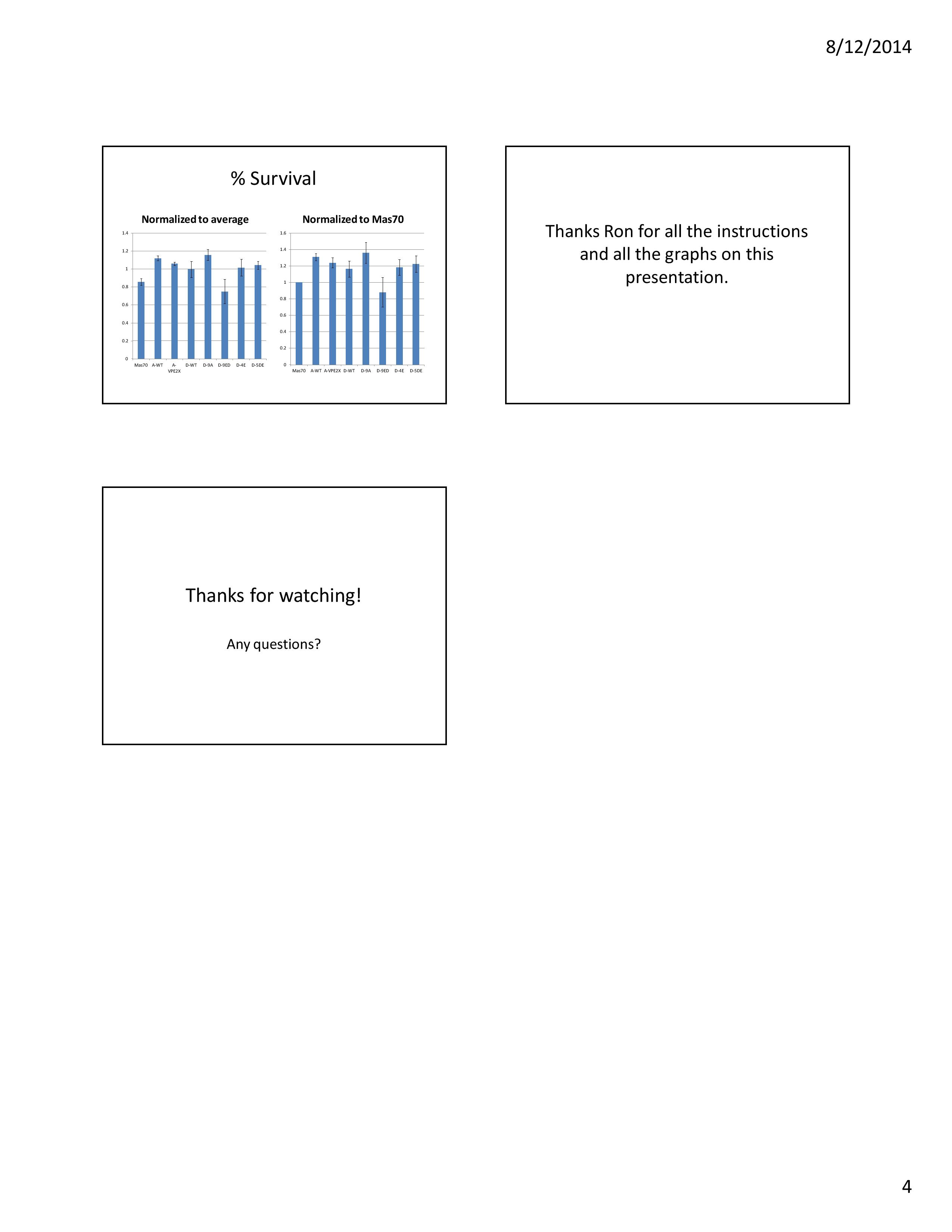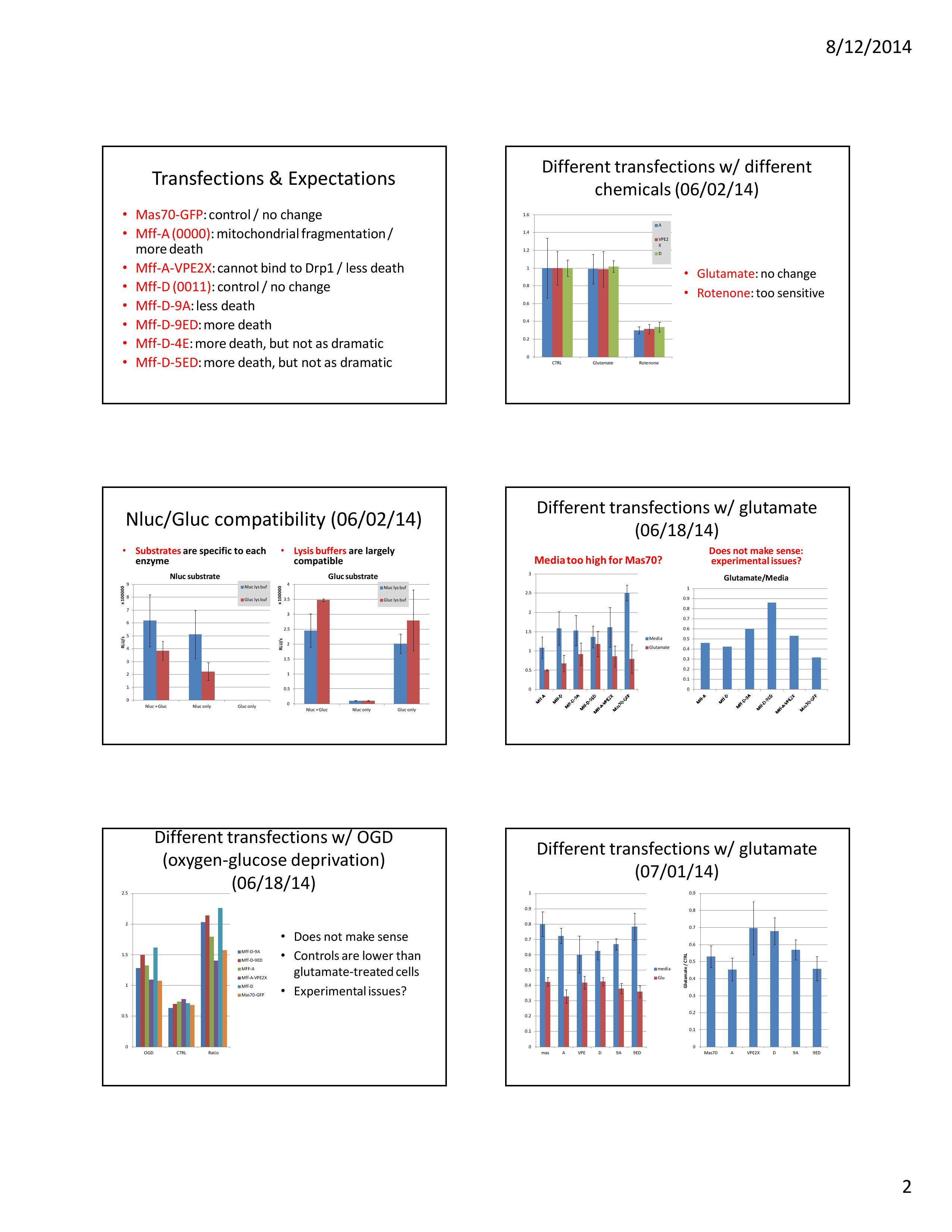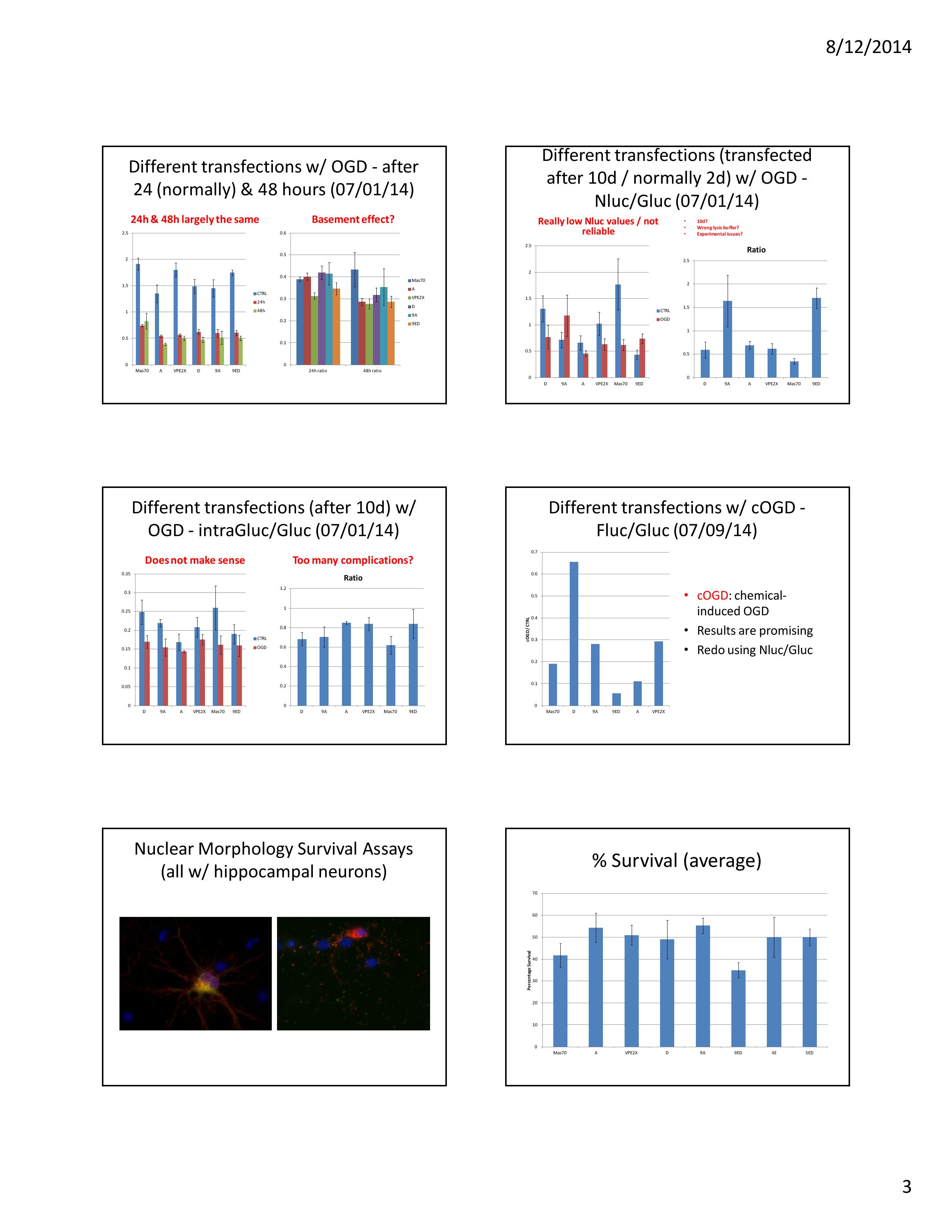 The results were shown in the slide below, which was taken from my final lab meeting presentation. We could observe that the results of the cOGD model largely agreed with our hypothesis except for the Mff-D transfection, which was supposed to be the control but ended up abnormally high in survival rate. Anyway we would redo this experiment with Nluc / Gluc combination since we knew that it would probably produce better results.