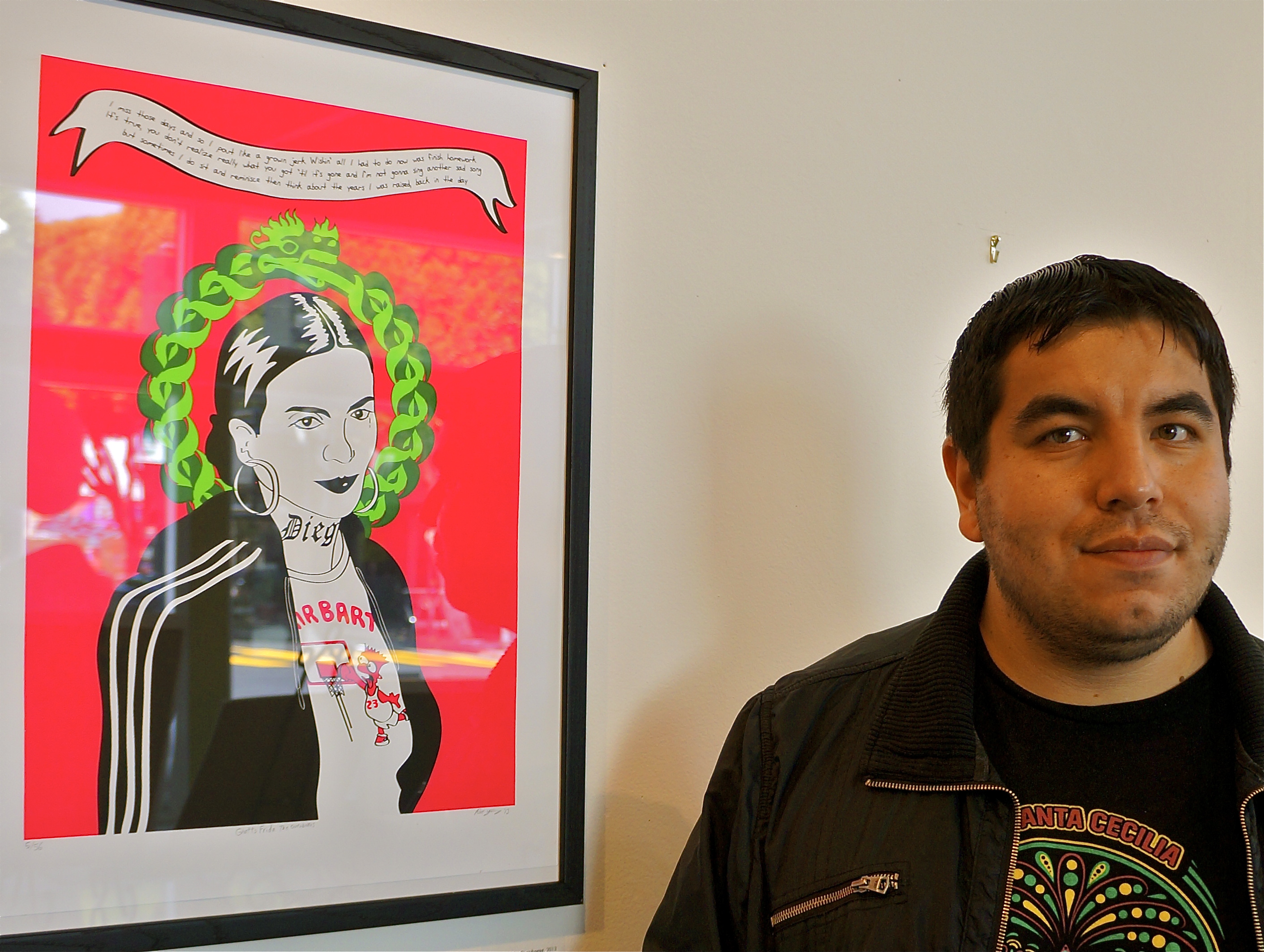 I visited with Rio Yañez a few days ago. He is a Chicano artist who has been surrounded by artists since he was a little baby! He is the son of two well-known artists: Rene Yañez and Yolanda Lopez. He even gave me a small tour of the area filled with a great amount of murals!! Public art in the form of murals or prints appear throughout the city. His current exhibition is called Pocho Adventure Club. His work combines Chicano iconography with his personal “mythologies” derived from comic books. One of his images shows a traditional figure like Frida Kahlo wearing a Bart Simpson t-shirt! His work made me more aware of how much contemporary Chicano art has changed in the last fifteen years or so.