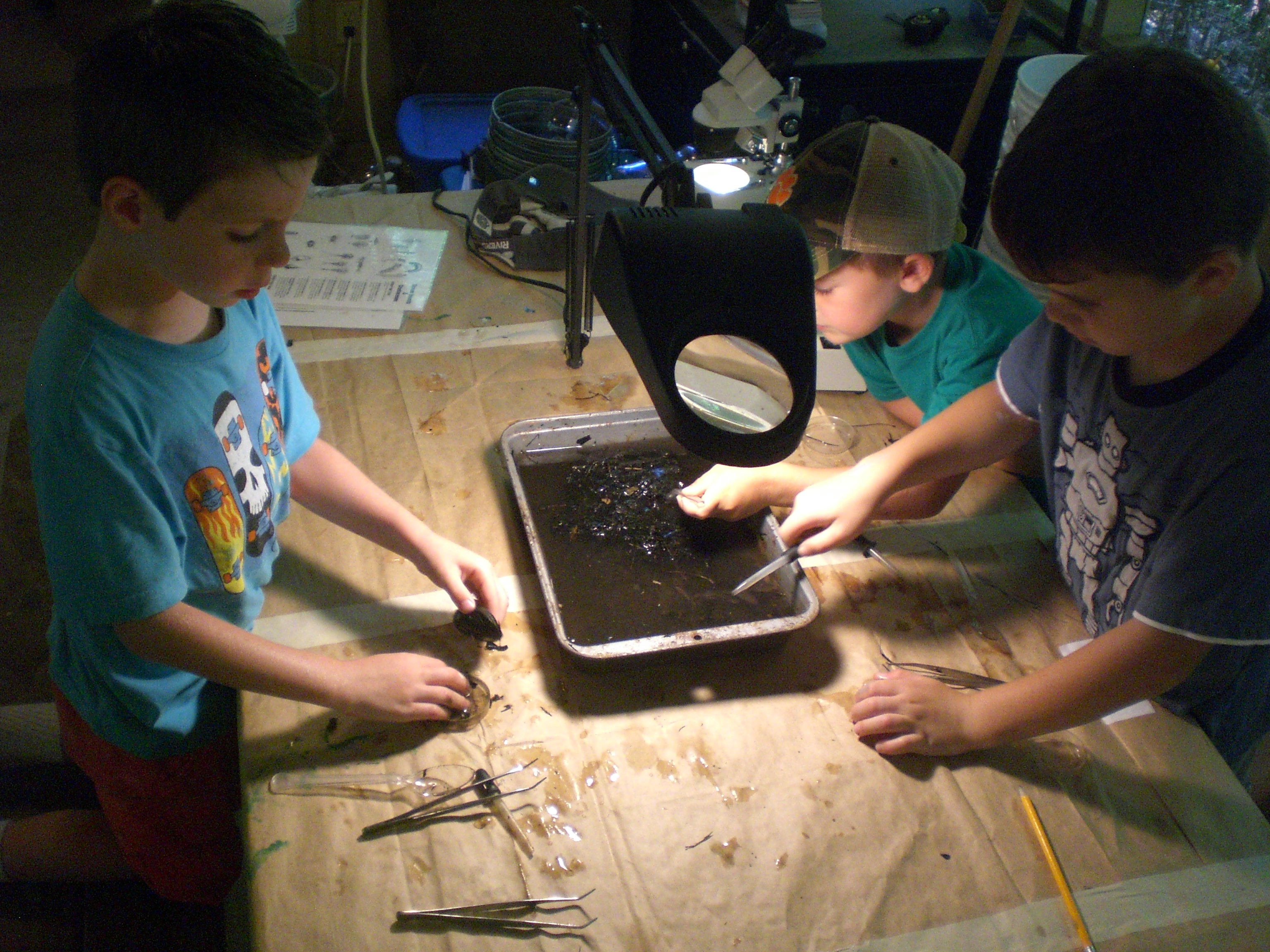 Another activity we partook in was benthic sampling. Matt got off the boardwalk and scooped up some leaf litter, mud, and tiny twigs from the bottom wet part of the swamp while the kids watched. Then we filtered it and laid it out on metal pans for the kids to pick through. I was surprised every time by how much life was in each scoop. From large motionless mussels to wriggling larvae to frantic crayfish, you could make a pretty strong hypothesis that the swamp was pretty healthy and full of living and growing creatures.