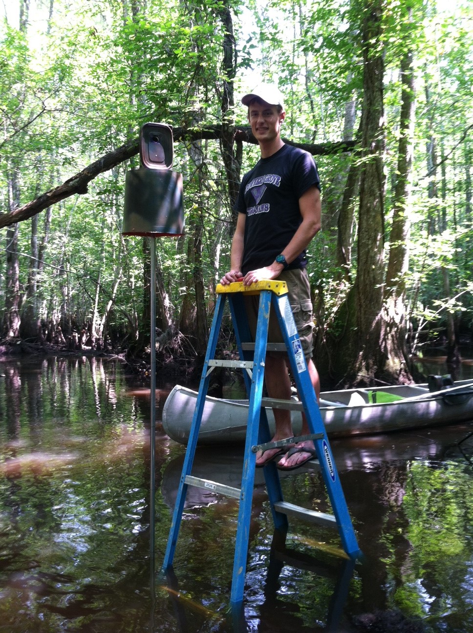 The other update on the Prothonotary front is about the nest boxes I have been constructing. I am almost done building my goal of 20 nest boxes and I have only just started installing them. On Monday, Matt and I went out to experiment with installation. What is the easiest way to drive the metal post in to the ground? How will we stabilize the nest box once it is in the ground? How far away should they be from each other? How many can we realistically install in one trip if our canoe can only hold so many? After an afternoon of playing around in the boat and getting our legs and feet wet, we installed three boxes and made it back right when everyone was leaving for the day. Based on past Prothonotary Warbler nest box studies, we decided to space them 50-100m apart so if consecutive boxes are used, they won’t be uncomfortably close for the territorial yellow-feathered friends. I won’t bore with the other minute details but if you are interested you can email me at Nschillerstrom15@cornellcollege.edu. We installed 3 nest boxes that were still standing at the end of the week when Mike showed me the rest of the canoe trail off-shoot where I will be installing them.