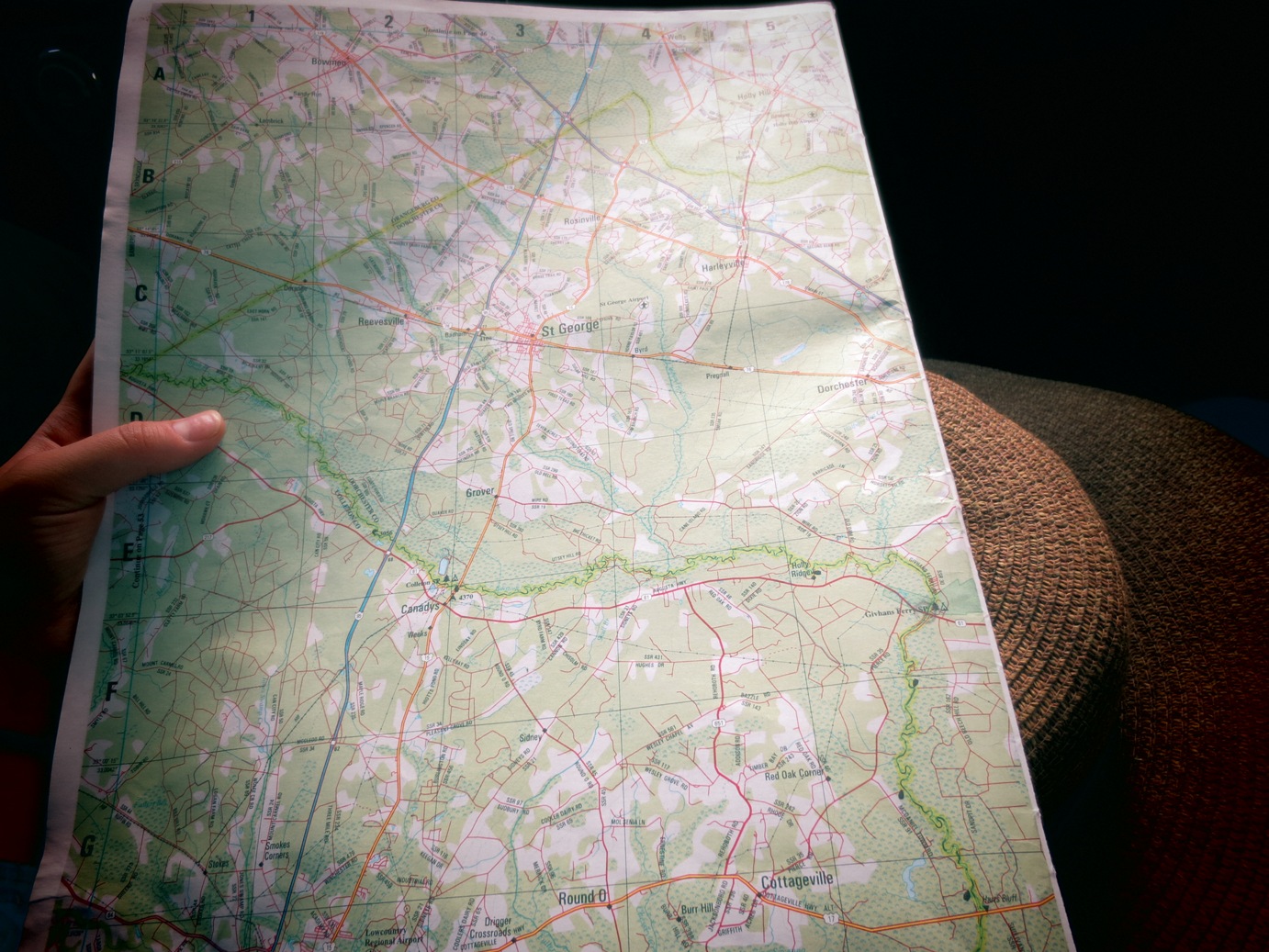Sampling continues: Wednesday morning started with loading our car at 7:30 am and leaving at around 8:00 am as usual. Our area of interest was Four Hole Swamp Watershed, around 50 miles southwest from Columbia, and we got to visit seven sites that day. I know that I have a poor sense of spatial orientation. Always being a passenger also contributes to this insensibility. Personally, I had never even tried to precisely orient myself wherever I went, because knowing exactly where and how my location stands in relation to the surrounding geographic extent before physically exploring makes the Earth seem much smaller (and flatter) and less enthralling. I prefer to have a child’s perspective on new places so that there is something to be discovered from my eye level instead of seeing things from above and having complete control and knowledge of it. But, not when working! In order to better my map reading and navigation skills and to be more involved from my passenger’s seat (which tends to be conducive to sleepiness especially after getting 5 hours of sleep the previous night), I decided to closely follow our route on the map. It kept me alert, and having a good understanding of where we fit in the big picture would help me see how the streams and rivers I am sampling from travel and diverge.