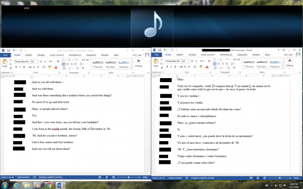 Over the past week, I have been focused on finishing transcription and beginning translation of my first interview. Once this is completed, I will move on to a second interview to get as far as possible before my time here ends. Fortunately, I have finally found a process which works for me; transcription can be painstakingly slow and monotonous if not handled appropriately.