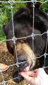 Lucky finished his enrichment and went to the bear scale and started to destroy it. I was confused at first, but then I saw it. My co-workers left out a bucket of trail mix and it was behind the scale and electric wire. I don’t know if Lucky saw it, but he could certainly smell it, and he was going to find it. I described the situation carefully so the people with me would think everything was okay, but also to alert my co-workers at lunch. Apparently, they ran out when they heard. Sharon, our bear curator, was outside and couldn’t hear me, but she saw the bucket and realized the situation herself. She grabbed it and called Lucky. At that point, the bear was having too much fun tearing the scale apart. Sharon went into the enclosure which she does only when she sees it necessary and called him, got his attention and emptied the bucket of trail mix right there.