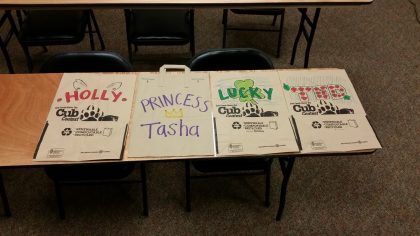 We decorated goody bags to sell and made four special ones for each of our bears to auction off. The winners of the auction got to give the bears their goody bags. The smaller bags we sold were hidden in the big enclosure by the Lilypad peeps for the bears to find and forage.