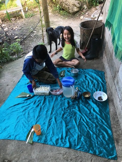 The plants of the garden are not only good for physical ailments, but are also good for mental health and a sense of well-being. I’m more at peace here in the Amazon than I have been for many months. The jungle has so much fun to provide; for example, after showering in a small waterfall, Sofia and Alejandro (her nephew) wanted to have a picnic. At first I wasn’t sure of what they were saying, but as Sofia explained and drew a picnic blanket full of food, I realized that they were using English word. They were very excited about it, and never had a picnic before. We had snails, popcorn, onion and tomato salad, hot cocoa, and salac fruit. It was tasty, and their excitement about it was contagious.
