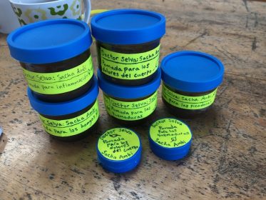 Last week I started making salves (herbal ointments) at Amu Pakin, the Kichwa midwives’ association. I helped the midwives and their interns collect medicinal leaves from the chakra to put in the salves, and we also made a salve for burns out of achote oil.