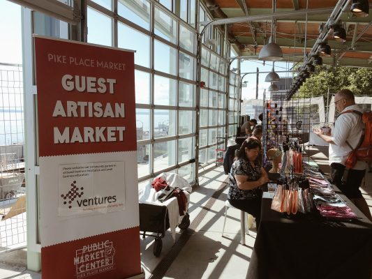 This week has been, by far, my favorite week at Ventures. It was the week of the Guest Artisan Market at Pike Place Market. A new covered pavilion was added to the Market last year and this summer it has been used to invite guest artisan vendors who don’t usually sell at the market to come for special pop-up events. This is a wonderful opportunity for our clients to access exposure for their products in both an iconic and busy marketplace. It was my first time getting to meet Ventures’ clients and to be able to see their products in action. I have been working hard the past few weeks in anticipation for the Market, and I had a lot of fun working it.