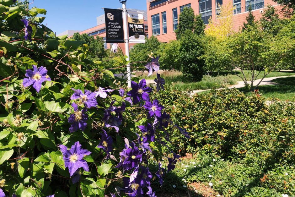 I took my own advice about moving, and went for a walk outside to explore campus. I found some gorgeous purple flowers in front of a CU Anschutz Medical campus sign (Go Rams!)
