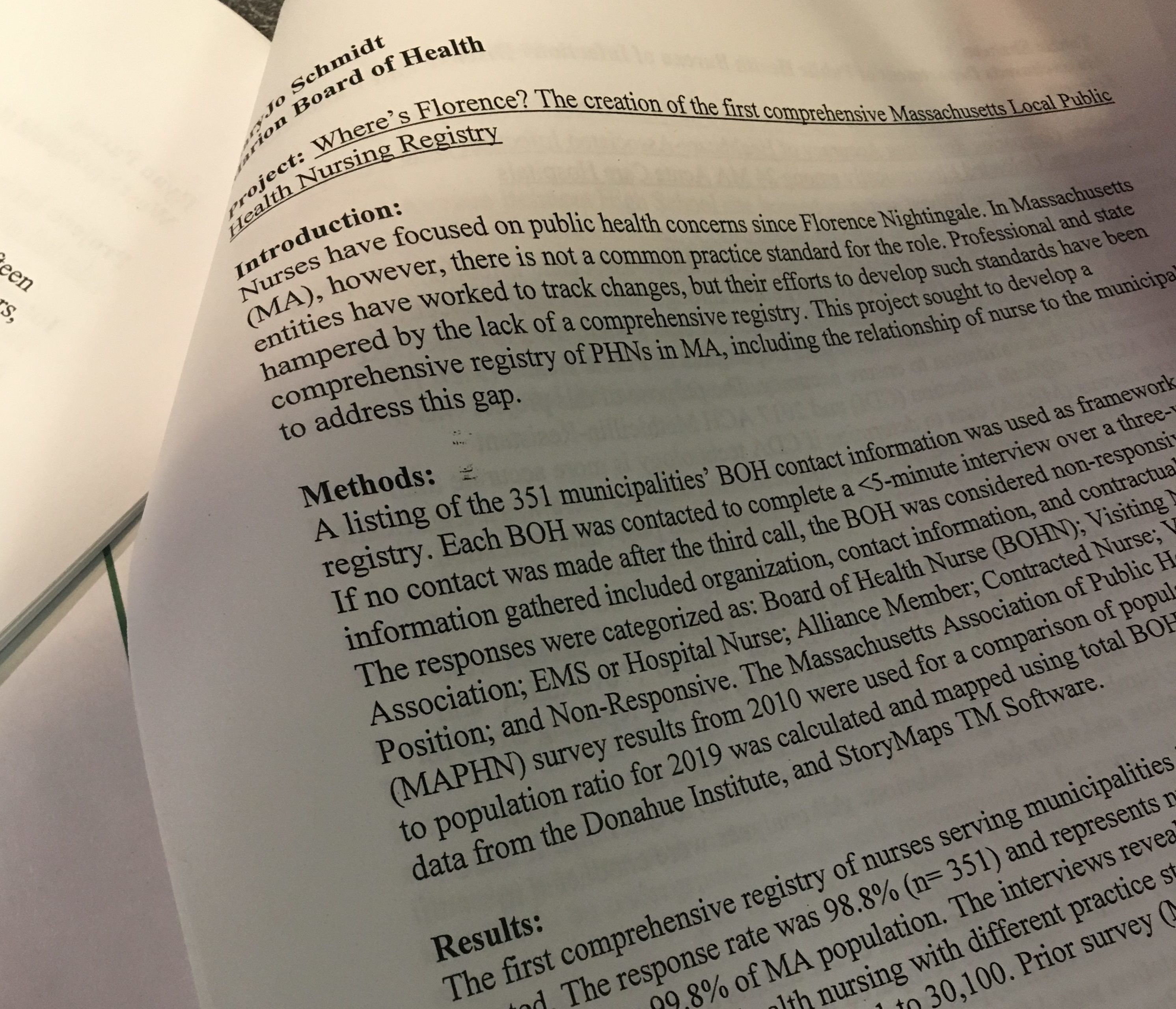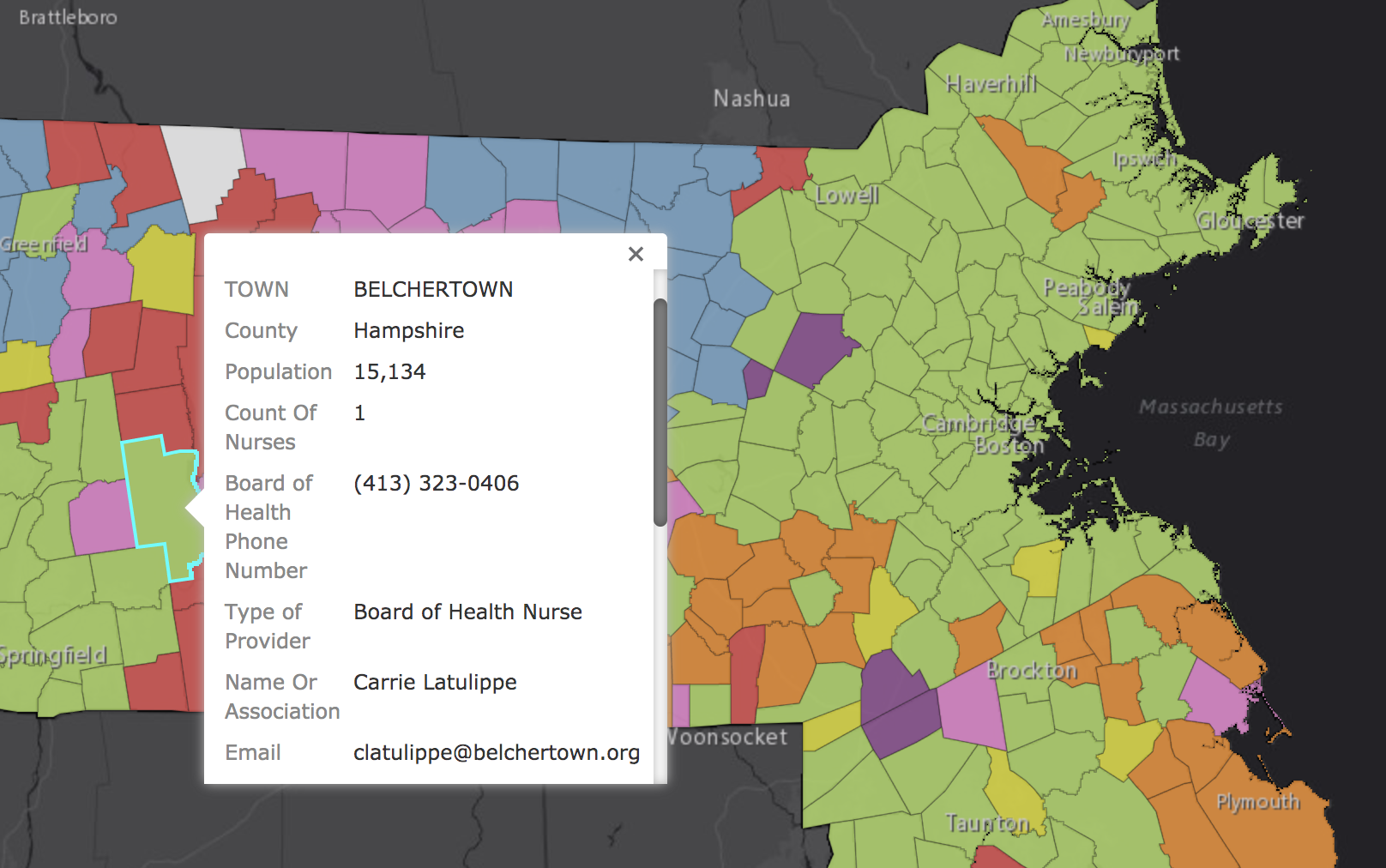 This a part of my work that really brings what I made with the registry to life. The photo above is of my first map. This shows which type of public health nursing each town used by color. As you can see, in the western part of MA, which is more rural, there are not as many Board of Health Nurses as there are on the eastern part of MA which more populated. This map illustrates just how many types of nursing exist and how they are being utilized throughout the regions in the state. One of the coolest features is clicking on any one town will show a pop-up of that towns nurse and contact information for that Public Health Nurse. Hopefully, if this data becomes more widespread, laypeople or officials within MDPH can use that feature to find and contact a specific nurse of interest. The MDPH Office of Local and Regional Health had fortunately agreed to keep the registry up to date from here on out so it can remain a comprehensive updated registry.