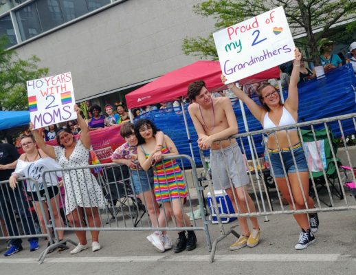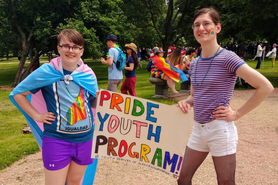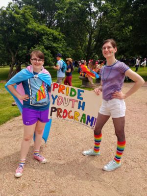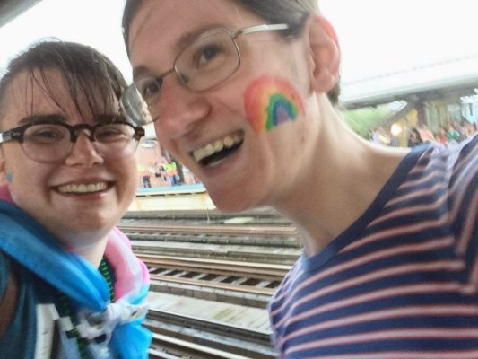 On Sunday morning we got decked out in our best gay and trans gear, stuffed a bag full of snacks, and headed towards the nearest purple line stop to take the train to the start of the parade route. As we walked to the train, a few cars surprisingly honked in support. The train was packed with rainbow folks and we had to squeeze to get off the train as we were getting off at the earliest spot. When we met with youth services folks, young people were making signs and painting themselves and each other with body paint. I took the risk of painting a trans flag and rainbow on Jean’s face, which turned out fairly well for me not being artistically inclined. Before the parade, we all introduced ourselves with our names and pronouns, which is nearly instinctual now that I’m four weeks into queer youth work.