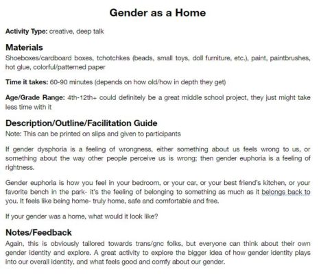 I also spent time working on my activity binder project, developing a template, reviewing and formatting the activities that have been submitted so far. Many of the activities are creative, and my favorite activity is “Gender as a Home”, pictured below. I can imagine this being a fantastic activity for gender non conforming folks of all ages. This project is mostly done on the digital end, I am just waiting for more staff submissions. My youth evaluations report is also being wrapped up, which I will discuss in more detail in my next blog.