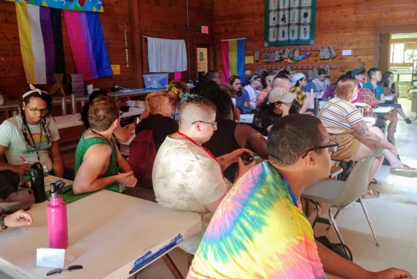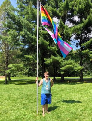 A big part of camp and my work at Youth Services is doing introductions with pronouns. All campers and counselors write their pronouns on their name tag, and we introduce ourselves saying our name and pronouns. For example, my name is Oliver and I use they/them pronouns. Many campers are questioning their gender and so we try to provide a safe space for campers to try out new names and new pronouns. We also have many trans young people so whenever I forget a camper’s pronouns, I just ask them again. One of my favorite parts of camp was the transgender caucus. The caucus took place during workshop time and is for people with a shared identity to come together, in this case, all participants were trans. Youth leaders facilitated this caucus. We started with introductions and then took some time to write and draw out our transition timeline which we all got to share. It was extremely encouraging to hear about how others questioned their identity and tried out different labels before settling on one. I was also inspired by all the courage young trans people have in coming out to parents and teachers that are not always the most affirming.