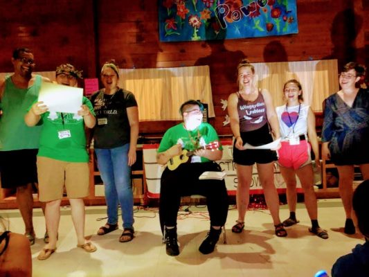 The mixer was a very magical dance event that inspired all of the beautiful fairy decorations and lights. I was so grateful that a camper made me a beautiful flower crown to wear. The talent show was also fantastic. I really enjoyed a camper performing a dramatic reading of the song Karma Chameleon. Our co-director Nat danced to the Spice Girls with some other counselors which was fantastic. I was a part of the Youth Services Choir where we sang The Rainbow Connection by Kermit the Frog, as pictured below.