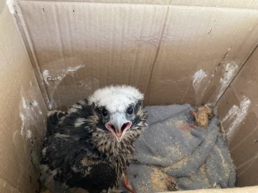 We recently got a new raptor who came from the state of Washington. He is a human-raised Peregrine Falcon, who is about a month old, and his name is Tigerhawk. Ryan showed us how to make jesses, using Tigerhawk as an example. Jesses are what allow falconers to control and handle raptors. They are very helpful when glove training raptors, which we do so we can use our raptors for educational programs. Jesses are made of kangaroo leather, which is becoming more popular making it very expensive and difficult to find.