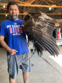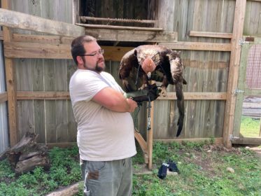 This week was crazy! We started to get a mew ready for our new raptor, which is a full-grown golden eagle. This eagle came to us from Bramble Zoo in South Dakota. He has an injured wing and needed a place for additional rehabilitation to be released back into the wild. This eagle will be living in a flight cage off exhibit until its wing is fully healed. The flight cage is a building with five mews, two of which hold the bate birds. The bate birds are what we use to catch birds of prey. In one mew, we have pigeons, and in another, we have doves and a starling. To prepare for this new raptor, we had to get one of the empty mews ready. We started out by critter-proofing the mew with mesh, including the bottom of the mew. We then covered the entire bottom of the mew with rocks and created a perch for the eagle. We then cleaned out a big water trough for the eagle. For our boss to pick up the eagle, we had to clean out the van and the travel box for the eagle. We placed a protective tarp down in the van and put the travel box on top. This preparation enabled our boss to easily drive the van to get the eagle early in the morning without worrying about having everything he needed for the eagle.