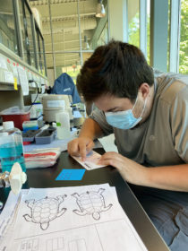 After having Monday off for Memorial Day, we got right back to work early Tuesday morning making final preparations for microbiome sampling. The box turtle microbiome project consists of tracking all tagged individuals in Forest Park and Tyson Research Center, and then collecting a series of swabs, a blood sample, and performing a general health assessment. For each turtle, three swabs are taken from each hind foot, three swabs are taken from the cloaca, and four swabs are taken from the mouth for a total of 13 swabs for each individual. With 15 turtles included in the study, that’s a total of 195 swabs that need to be placed in individual tubes! The purpose of this study is to gain a better understanding of the unique microbial communities present on turtles and how they vary depending on habitat and time of year. The samples are also tested for four viral pathogens that have been observed in box turtles: morbillivirus, arbovirus, ranavirus, and reptilian herpesvirus. One possibility being explored is increased disease susceptibility within the urban population (Forest Park) due to increased anthropogenic (human-caused) factors including stress and the introduction of new pathogens through pet drop-offs.