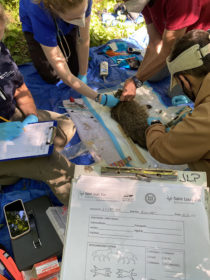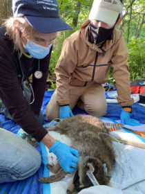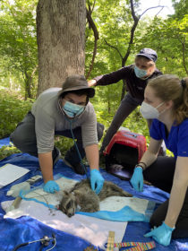 On Thursday night, baited traps were placed in the park with the hopes of capturing new small carnivores to become part of the study. Early Friday morning I received a text that two raccoons had been caught the night before. I rushed over to the park just after 6:00am and was able to assist with two knock-down procedures on the raccoons. Under anesthesia, a full health assessment was performed on both individuals. Overall body condition was assessed and samples of blood and hair were collected along with swabs to test for pathogens. Radio collars were also placed on the raccoons in order to track their movements as part of the study. Before one of the raccoons was given the the reversal to the anesthetic, I had the opportunity to listen to its heartbeat and breathing. It was truly an amazing experience! Both raccoons were successfully released and made their way back into the park.