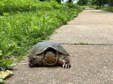 On Wednesday we started sampling for the project in Forest Park. Unfortunately, our ability to track turtles was limited by the weather as there were intermittent showers for most of the day. We were, however, able to collect samples from 5 of the 8 Forest Park turtles and headed back to the zoo to process the samples. Along with ensuring that the microbiome swabs were stored in their proper sample boxes, we also finished labeling blood slides prepared in the field and worked up the blood samples taken from the turtles. I was able to prepare hematocrit samples to analyze packed cell count (amount of red blood cells) and also examine total blood solids using a refractometer. It was interesting comparing the blood samples to mammalian samples and seeing the differences and similarities. One major difference is that reptilian red blood cells (RBCs) are nucleated whereas in mammals RBCs in circulation are unnucleated. We also saw a common snapping turtle walking down the sidewalk and had to stop and get a quick picture!