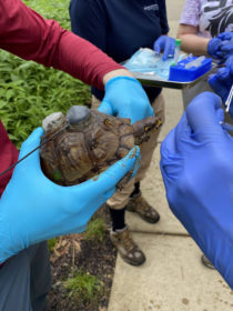 Thursday we continued sampling by collecting samples from all 7 tagged individuals at Tyson Research Center. The weather was much more cooperative for tracking and we were able to collect samples from all the individuals before we headed off for lunch. In the afternoon, we worked up all of the Tyson samples back at the zoo and got ready for our final day of sampling on Friday. We were able to collect samples from the remaining three turtles and ended a very successful first microbiome week!